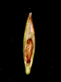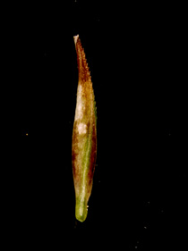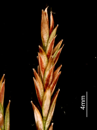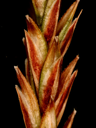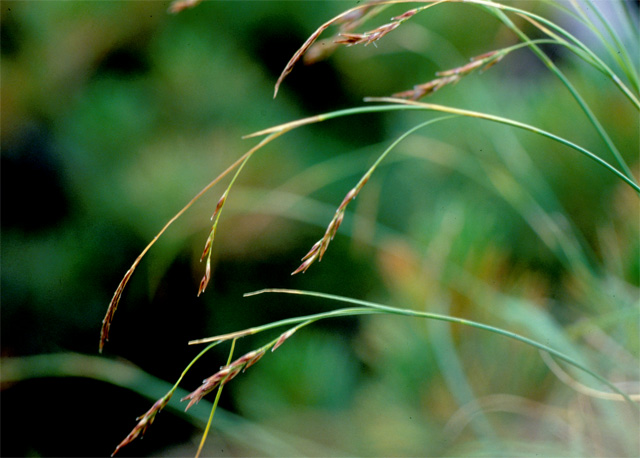 【同定のカギ】高山の岩地に生える多年草で、叢生する。雌小穂は、赤褐色で長い柄を持つ。鱗片は短褐色で、果胞より短い。果胞は、無毛、基部は短柄、上部縁に細鋸歯、上部が狭まって嘴となり、口部は斜切形。痩果の基部に長い柄がある。柱頭は3岐。Carex stenantha Franch. et Sav. var. taisetsuensis Akiyama 【国内分布】北海道の高山。【国外分布】千島、サハリン、カムチャツカ。 【ノート】タイセツイワスゲは、イワスゲに似るが、果胞が幅広く長楕円形で嘴が短い。