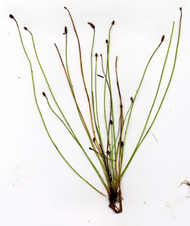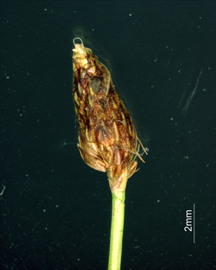 Eleocharis ovata (Roth) Roem. et Schult. 【国内分布】北海道、本州。【国外分布】ヨーロッパ、シベリア、満州、アムール、ウスリー、インド。 【同定のカギ】日当たりの良い湿地に生える多年草で、通常匐枝はなく、軟質。有花茎は、細い円柱形、高さ15−30 cm、縦に溝がある。小穂は、卵形、長さ7−12 mm、花が密につき、淡褐色。鱗片は、長さ約2.5 mm、鈍頭−円頭、全体に膜質で褐色。痩果は、長さ1 mm、完熟後淡褐色となる。柱基は、圧扁された3角錐状。刺針状花被片は、6本、長さは痩果の1.5−2倍。柱頭は、2岐。 【ノート】シカクイに似るが、柱頭は2岐で異なる。また、柱基が3角錐状であり、クロミノハリイやタマハリイとは異なる。