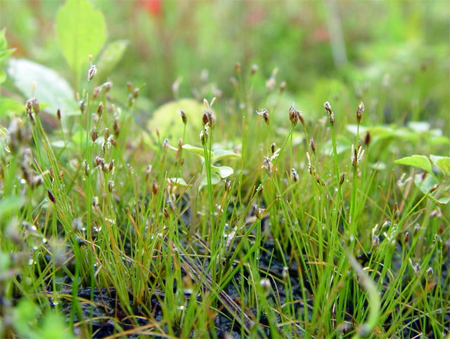 【同定のカギ】休耕田や湿地に普通に見られる1年草で、細長い根茎の節から植物体が叢生する。有花茎は、細く、長さ3−8 cm。小穂は、狭卵形、長さ2−4 mm、数個の鱗片を疎らにつける。鱗片は、長さ1.5−2 mm、円頭、薄膜質、紅褐色を帯びる。痩果は、長さ約1 mm、隆起する縦肋がある。柱基は、扁3角錐形。刺針は、3−4個、痩果より長い。柱頭は、3岐。Eleocharis acicularis (L.) Roem. et Schult. var. longiseta Svenson 【国内分布】北海道、本州、四国、九州。【国外分布】東シベリア、満州、韓国、中国、インドシナ、台湾。 【ノート】マツバイは他のハリイ属に比べて有花茎が特に細く短く、果実の葉面に隆起した格子状紋がある。