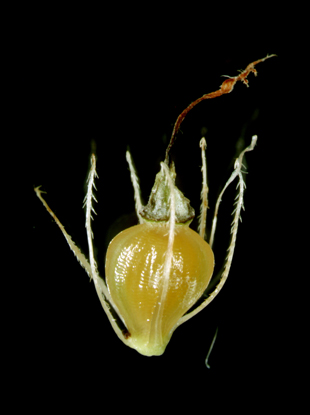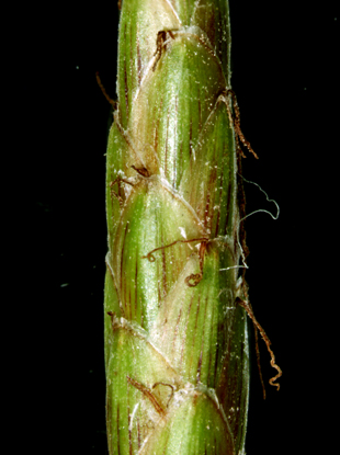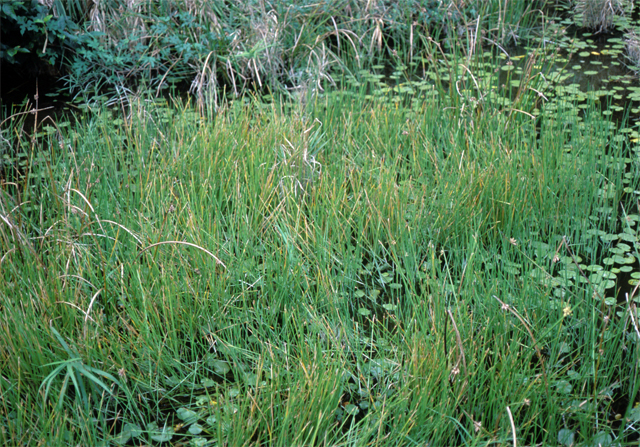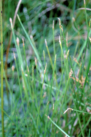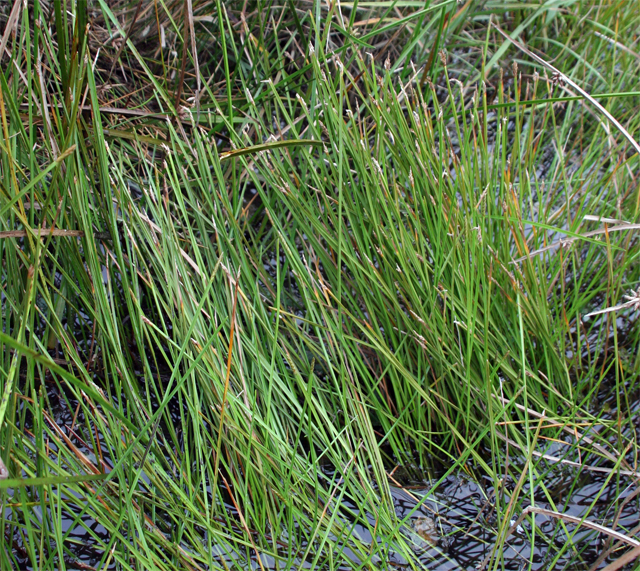 【同定のカギ】ため池や水田の湿地に希に見られる多年草で、匍匐根茎は長くやわらかい。有花茎は、太く、高さ30−80 cm、幅3−4 mm、3稜形。小穂は、円柱形、長さ2−4 cm、鋭頭、淡緑色。鱗片は、長さ6−8 mm、鈍頭、淡緑色、縁はざらつく。痩果は、長さ2 mm、表面に格子状の模様がある。柱基は、3角錐形。刺針状花被片は、6本、痩果より長く、疎らに下向きの剛毛をつける。柱頭は、3岐。Eleocharis acutangula (Roxb.) Schult. 【国内分布】本州 (愛知県、大阪府、和歌山県、香川県)、九州、琉球。【国外分布】台湾、中国南部、アジア熱帯域、オーストラリア北部、アフリカ、北アメリカ南部、南アメリカ。 【ノート】ミスミイは、ため池などの湿地に希に見られる。小穂が円柱形で、有花茎に隔膜がないのが特徴である。