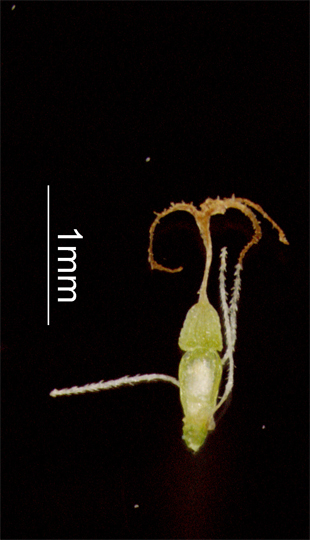 【同定のカギ】池の周辺や湿地に生える1年草または多年草で、匐枝はない。有花茎は、細く、直立または斜上し、高さ20−50 cm。小穂は、頂生し、長さ5−7 mm、狭卵形、密に花をつけ、時に基部に腋芽ができる。鱗片は、長さ2−2.5 mm、鈍頭−円頭、一部に錆色の部分がある。痩果は、長さ1−1.2 mm、黄緑色、横断面は鈍3稜形。柱基は、3角錐状、幅は痩果の1/3、長さは幅の1.5倍である。刺針状花被片は、6本、痩果の約2倍の長さで下向きにざらつく。柱頭は、3岐。Eleocharis congesta D. Don var. congesta f. dolichochaeta T. Koyama 【国内分布】本州、四国、九州。【国外分布】台湾。 【ノート】ハリイとよく似ているが、植物体が大きく、鱗片の長さは2−2.5 mm、痩果の長さは1−1.2 mmと大きい。また、刺針状花被片の長さが痩果の約2倍長い。ハリイと形質が連続する個体もあり、今後検討が必要である。