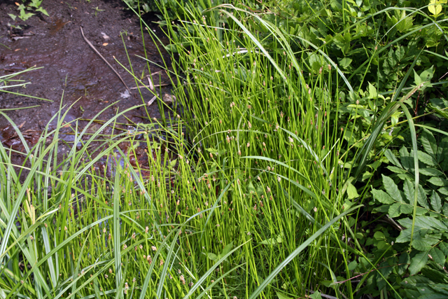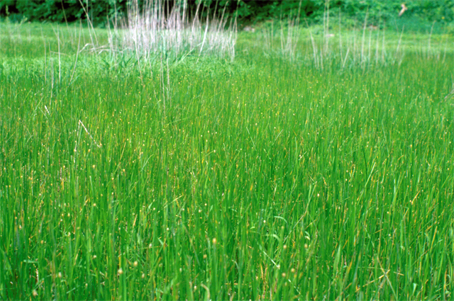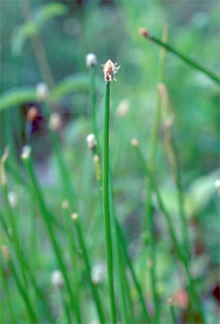 【同定のカギ】山地の湿地や池の周辺に群生する多年草で、長い匍匐根茎がある。有花茎は、太く、高さ30−60 cm、幅2−4 mm、円くて平滑、柔らかく、つぶれやすく、有花茎の内部は綿状。小穂は、長さ1−2.5 cm、鈍頭、濃褐色。鱗片は、長さ約5 mm、薄膜質、鈍頭、濃褐色。痩果は、長さ1.5−2 mm、横断面はレンズ状、熟すと淡褐色となり光沢がある。柱基は、小さく、長さは痩果の約1/3、3角錐状、やや丸い。刺針状花被片は、5−6本あって、痩果の約2倍の長さがあり、下向きにざらつく。柱頭は、2岐。Eleocharis mamillata Lindb. fil. var. cyclocarpa Kitag. 【国内分布】北海道、本州、九州。【国外分布】朝鮮南部、サハリン、ウスリー、満州。 【ノート】クログワイに似るが、小穂は円筒形とならず、有花茎には隔膜がない。