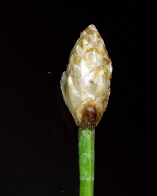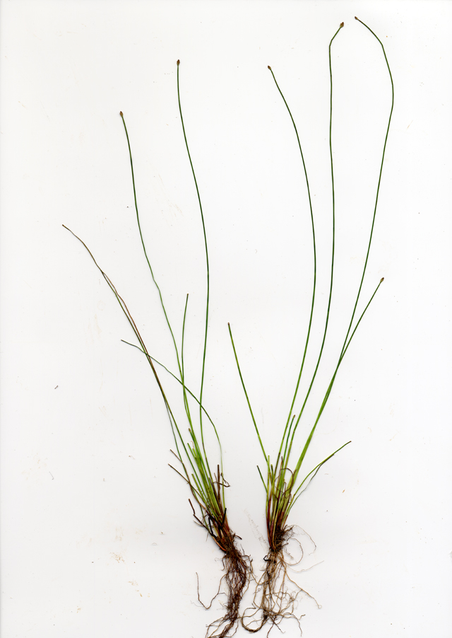 【同定のカギ】日当たりの良い湿地に生える多年草で、あきらかな匐枝はない。有花茎は、細い円柱形、高さ20−50 cm。小穂は、長さ7−12 mm、淡褐色。鱗片は、鈍頭−円頭、短い芒があり、全体に膜質で淡色。痩果は、長さ1 mm、横断面は鈍3稜形、完熟後淡褐色となる。柱基は、圧扁された3角錐状、幅は痩果の2/3−3/4、長さは幅より少し短い。刺針状花被片は、6本、痩果とほぼ同長またはやや長く、下向きにざらつく。柱頭は、3岐。Eleocharis attenuata (Franch. et Sav.) Palla 【国内分布】本州、四国、九州、琉球(沖縄島、宮古島)。【国外分布】朝鮮南部、中国。 【ノート】ハリイとよく似るが、柱基の幅が痩果の2/3−3/4で扁3角形である。また、刺針状花被片がハリイより短い。