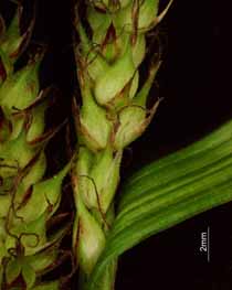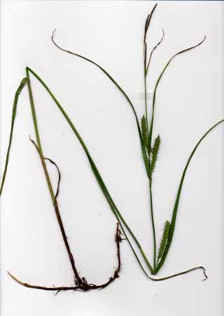 【同定のカギ】土手や路傍の草地、林縁に生える多年草。長い匐枝がある。基部の鞘は密に毛が有り、糸網を生じる。苞の鞘も密に有毛。雄小穂は3-5個、雌小穂は有柄で密に果胞を付ける。果胞は、有毛で長い嘴を持ち口部は2裂する。柱頭は3岐。(C. drymophila Turcz. var. glabrata (Franch.) Kuk.) 【国内分布】北海道(東部)。 【国外分布】サハリン、朝鮮、ウスリー。 【ノート】アカンカサスゲは、大型のスゲで長い匐枝を持ち北海道東部の路傍によく見られる。基部や苞の鞘に密に毛があり、果胞も有毛であることで区別できる。