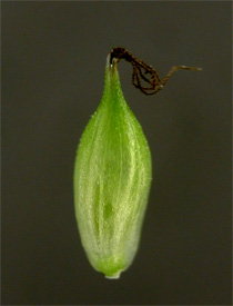 【同定のカギ】路傍、草原、林床に生える多年草で、長い匐枝を多数出す。雄小穂は線柱形で柄は短い。雌小穂は短柱形で、柄はなく下のものは離れてつきやすい。果胞は平滑で、嘴は短く口部は2歯となる。柱頭は3岐。【国内分布】北海道、本州、四国、九州、対馬。【国外分布】朝鮮。 【ノート】エナシヒゴクサは、ヒゴクサに比べて雌小穂の柄が無く、果胞の嘴がやや短いことで区別できる。ヒゴクサの集団に混じって出現することもあるが、個体数は少ない。