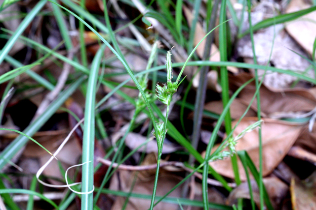 【同定のカギ】海岸付近の岩場や石垣などに生える多年草、半地上性の匐枝がある。苞葉は花序よりも著しく長い。小穂は柄がない。花茎の下のものは離れてつきやすく、根生状の小穂が付くことが多い。果胞はまばらに毛があり、上部は狭まり嘴は短い。痩果の頂部に小型の盤状付属体がある。柱頭は3岐。Carex meridiana (Akiyama) Akiyama (Carex leucochlora Bunge var. meridiana Akiyama) 【国内分布】本州(太平洋側:関東地方以南および伊豆諸島以西、日本海側:福井県以西)、四国、九州、対馬、屋久島、トカラ列島。日本固有。 【ノート】イソアオスゲはヒメアオスゲと同様、アオスゲ類の中では匐枝があり苞葉の葉身が長いことで他の種と区別する。また、ヒメアオスゲとは海岸付近に生育すること、果胞が長いことで区別する。海岸に生育するアオスゲの仲間で、苞葉の葉身が長く、根生する小穂が見られたらイソアオスゲの可能性が高い。