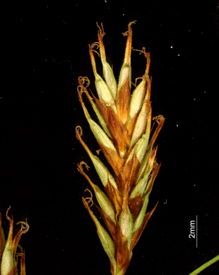 【同定のカギ】渓谷や川岸の岩上に生える多年草で、密に叢生する。基部の鞘は黒褐色で繊維状に細裂する。雄小穂は長く、線柱形。果胞は雌鱗片より長く、披針形、基部に短柄、密に短毛、長嘴、上部は褐色、口部は鋭2歯−2又となる。柱頭は3岐。【国内分布】四国、九州。日本固有。 【ノート】四国と九州の川岸の湿った岩場に広く分布し、大株となる。ソハヤキ (蘇速紀) 要素の分類群と考えられる。コイワカンスゲやミヤマイワスゲに似るが、雄小穂が長く黒褐色。