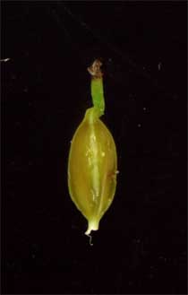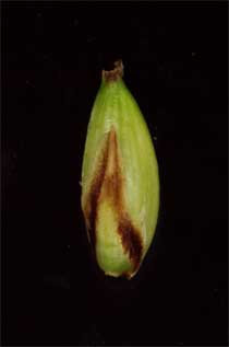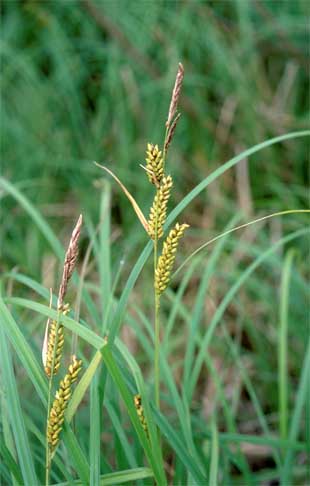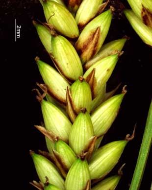 【同定のカギ】河口や入江の塩湿地、沿海地の淡水湿地に生える多年草で、群生し、横走する長い根茎がある。基部の鞘は帯赤色、前面に糸網を生じる。果胞は、雌鱗片より長く、長卵形、細脈があり、無毛、先端は太く短嘴、コルク質、光沢があり、口部は帯褐色で2歯となり、乾燥すると褐色に変色する。柱頭は3岐。【国内分布】北海道、本州、九州(北部)。【国外分布】朝鮮、中国東北部、ウスリー。 【ノート】オオクグはシオクグと似ているが、葉の幅が広く(幅5-10mm)、雌小穂が大きいことで区別される。