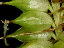 【同定のカギ】Carex rhynchophysa C.A.Mey. 【国内分布】北海道、本州(中部地方以北)。【国外分布】千島、サハリン、ウスリー、シベリア、朝鮮。 湿地に生える多年草で群生し、匐枝がある。雄小穂は線形で、3〜7個が密着して付く。果胞は、熟すと開出し、雌鱗片より長く、多数脈、無毛、長嘴、口部は鋭2歯となる。痩果は、ゆるく果胞に包まれ、長倒卵形、長さ2−3 mm、花柱は湾曲。柱頭は3岐。 【ノート】湿地で大株となり、雄小穂は太い柱形で柄がなく斜上し、密に果胞をつける。