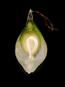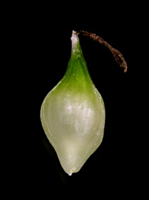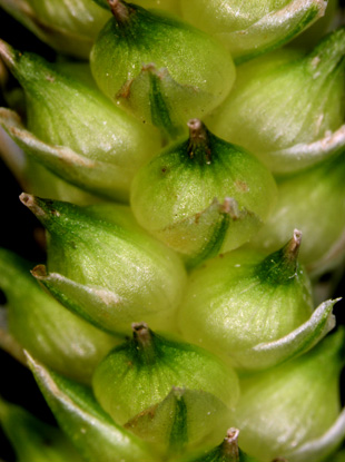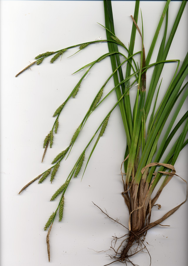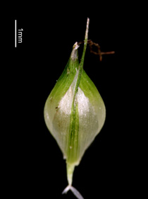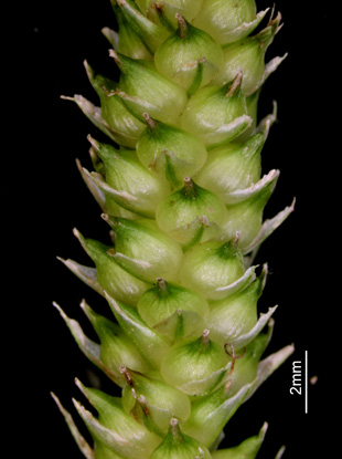 【ノート】ウミノサチスゲは、Tuyama(1938)により南硫黄島から報告された。セキモンスゲに似るが、葉の幅が広く、果胞は、熟すと痩果を緩く包む、幅が1.5〜2mmと広い。キノクニスゲとは果胞の幅が狭く、雌鱗片が果胞と同長または長いかで異なる。Carex augustini Tuyama 【国内分布】小笠原諸島、硫黄諸島。日本固有 【同定のカギ】湿った林床に密に叢生する。基部の鞘は淡褐色、古くなると繊維状に細裂。葉の幅は6〜18mm、硬く,滑らか。果胞は長さ4.5〜5.5mm、幅1.5〜2mm、太い脈があり、無毛、鱗片とほぼ同長。痩果は緩く果胞に包まれ、花柱基部は膨らむ。柱頭は2〜3岐。 写真は、2007年南硫黄島調査隊が持ち帰ったものを、神奈川県湯河原町で栽培し開花結実させたもの。勝山輝男氏による。