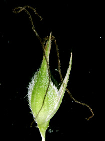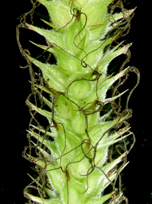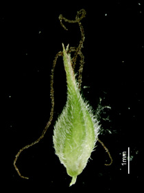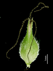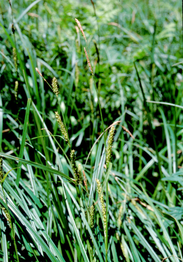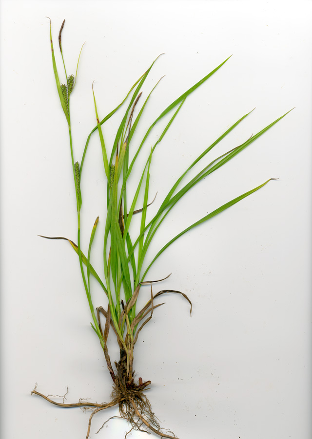 【同定のカギ】砂質の湿草地、山道脇に生える多年草。疎に生え、横走する長い根茎がある。基部の鞘、赤褐色、糸網がある。果胞、雌鱗片と同長またはやや長く、脈があり、密に有毛、先端は急に狭まり長嘴、口部は深く2歯となる。柱頭は3岐,宿存しやすい。Carex miyabei Franch. 【国内分布】北海道、本州、九州。【国外分布】韓国南部。 【ノート】ビロードスゲは、スナジスゲに似るが、果胞が小さく、嘴が急に狭まり長く、果胞に毛を密生することで異なる。ビロードスゲは、砂地によく見られ長い地下茎を伸ばす。