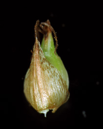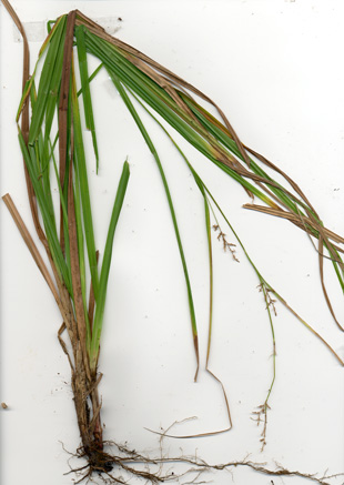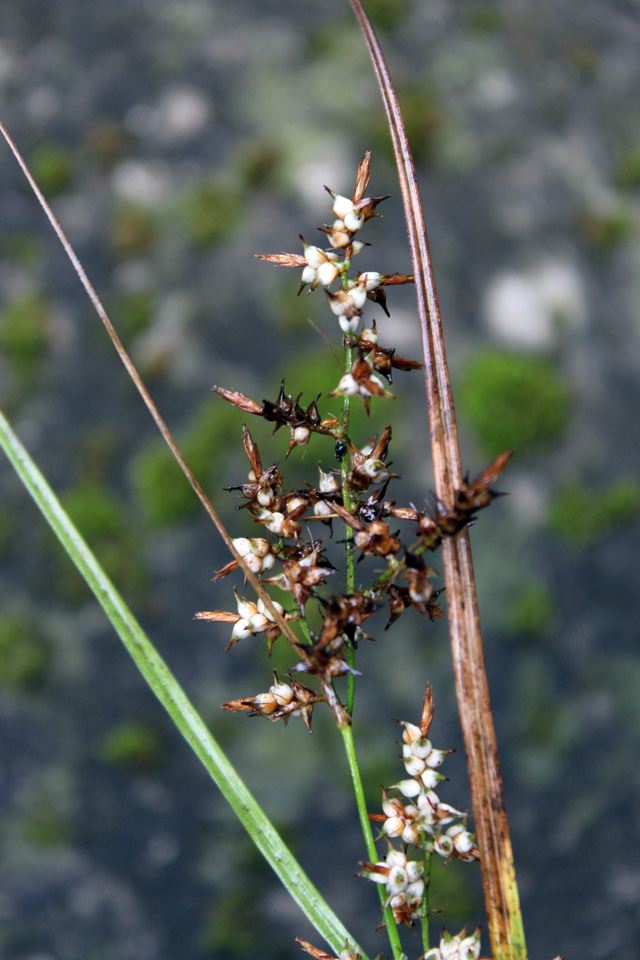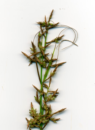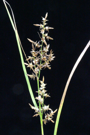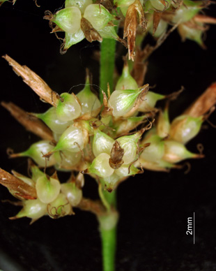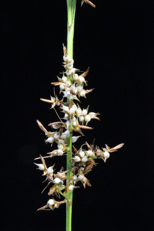 【同定のカギ】林縁のやや湿ったところに生える多年草で、ゆるく叢生する。苞葉の葉身は長い。花序は、円錐花序で、それぞれの花序には3〜6個の小穂がある。果胞は、雌鱗片から超出し開出する、稜間に細脈があり、無毛または嘴部がざらつき、嘴は長く、口部は斜めに切れる。完熟すると果胞は白くなる。柱頭は3岐。【国内分布】九州(長崎県、熊本県)、屋久島、種子島。【国外分布】台湾、中国南部、東南アジア、ヒマラヤ、オーストラリア。 【ノート】ハナビスゲは、熱帯性のスゲと考えられており、花期は秋である。完熟すると、果胞が白くなるのが特徴。