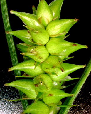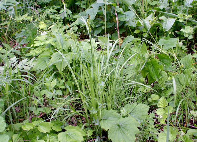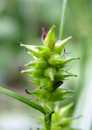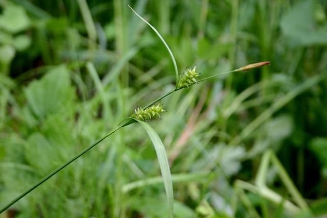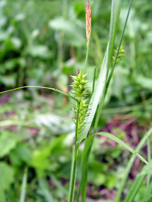 【同定のカギ】湿った草地に生える多年草で、ゆるく叢生する。葉や基部の鞘は、有毛。基部の鞘は、赤褐色。頂生する雄小穂は、長い柄がある。雌鱗片は、淡褐色で中肋は緑色。果胞は、:雌鱗片より長く、多数脈があり、無毛、やや長嘴。柱頭は3岐。【国内分布】北海道、本州(青森県、岩手県、秋田県、群馬県、長野県)、九州。【国外分布】朝鮮、中国東北部、ウスリー。 【ノート】ハタベスゲは、アカンカサスゲに似るが、柄の長い雄小穂は1個で、果胞に毛が無いことが異なる。