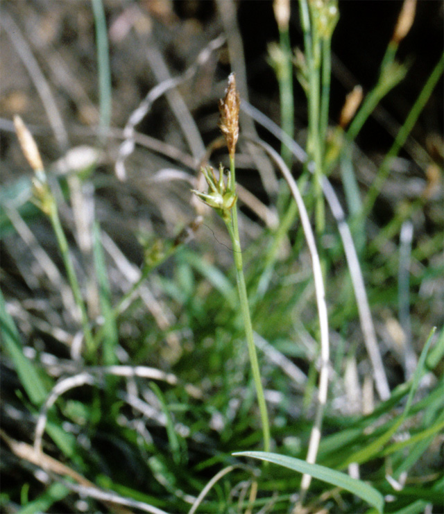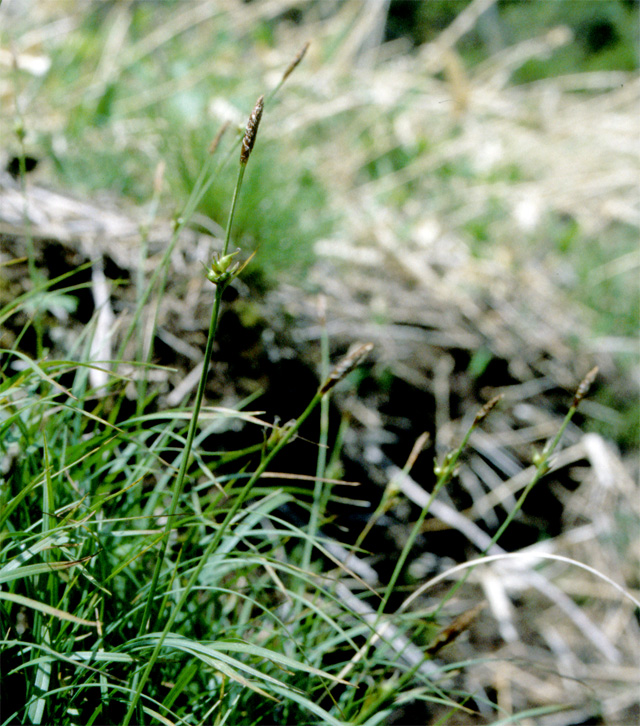 【同定のカギ】山地の砂礫地や草地、林縁に生え、密に叢生し、根茎は剛強。基部の鞘は、黒褐色で繊維状に細裂。果胞は、雌鱗片より長く、広卵形、長さ7−8 mm、有毛、長嘴で両側はざらつく、口部は2歯、外曲する。痩果は、頂部の付属体が湾曲する。柱頭は3岐。【国内分布】北海道、本州(中部以北)。【国外分布】朝鮮、千島、サハリン、東シベリア、中国東北部。 【ノート】アオバスゲやアオヒエスゲに似るが、果胞の脈が不明瞭で口部は深い2歯、痩果の頂部の付属体は湾曲することで区別できる。
