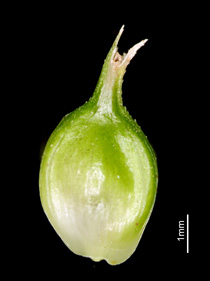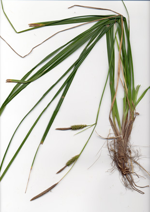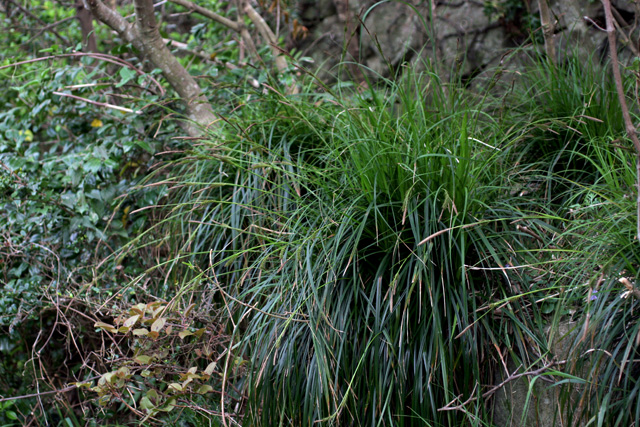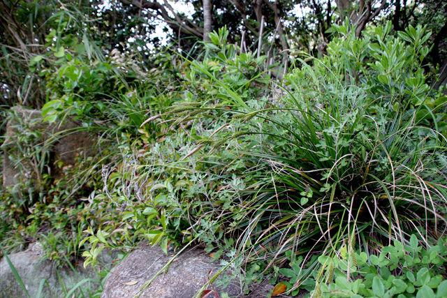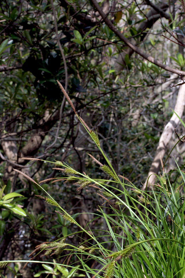 【同定のカギ】海岸の砂地やその近くの林縁に群生する多年草で、密に叢生し、著しく剛強。葉は、縁がざらつき硬い。基部の鞘は繊維状に細裂する。雄小穂を頂生し、側小穂は雄雌性で、1/3〜2/3は雄花。鱗片は、芒が大変長い。果胞は、雌鱗片より長く、革質、稜間に10−13脈があり、無毛またはまばらに短毛があり、上部に細鋸歯あり、しだいに狭まり長嘴となり、口部は2裂し外曲する。痩果は、頂部にある盤状付属体は湾曲する。柱頭は3岐で宿存する。【国内分布】本州(千葉県、石川県以西)、四国、九州、対馬、南西諸島、伊豆諸島、小笠原。【国外分布】台湾、済州島。 【ノート】海岸の岩場や路傍および林縁に大株となって生育し、雌鱗片の芒が大変長いことで他の種と区別できる。