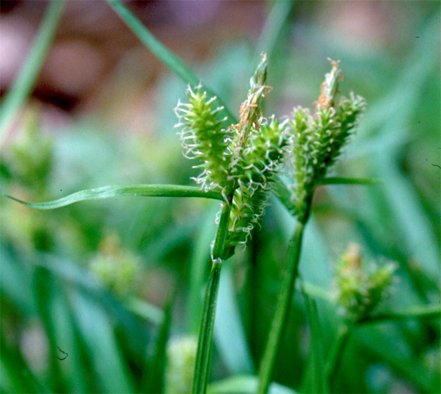 ヒメシラスゲは、小穂が茎の上部に集まってつき、匐枝を持ち、果胞の嘴が長い。