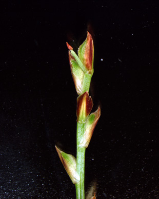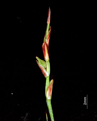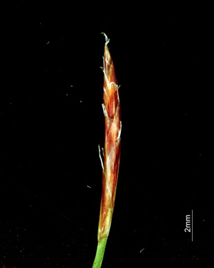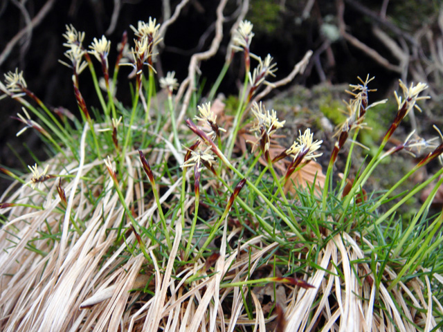 【同定のカギ】山地の林床や斜面および岩上に生える多年草で雌雄異株。マット状に生え、短い匐枝を持つ。有花茎は、短く高さ4〜10cm。基部の鞘は、赤褐色。雄株は、線形の雄小穂。雌株は、線柱形の小穂で、疎らに果胞を付ける。果胞は、雌鱗片と同じかやや長く、疎らに短毛が生え、嘴は外曲し、口部はほぼ平切形。柱頭は3岐。【国内分布】本州、四国、九州、対馬。日本固有。 【ノート】ヒナスゲは小型で雌雄異株であり、基部の鞘や鱗片が鮮やかな赤色を帯びる。雌雄同株となったものはサナギスゲである。