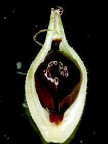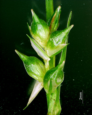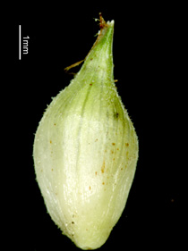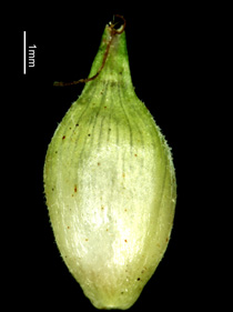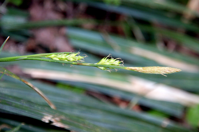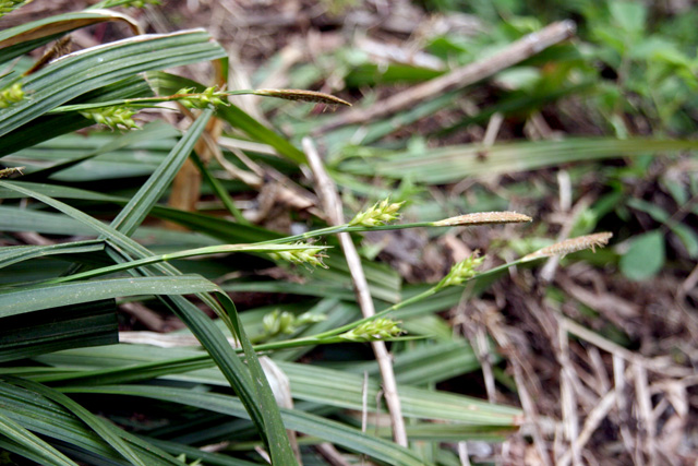 【同定のカギ】やや湿った樹林内に生える多年草で、まばらに叢生する。葉は、幅が8−15 mm。有花茎は、短いものは葉の基部に埋もれる。鱗片は淡褐色。果胞は、雌鱗片より長く、熟すと開出し、短毛があり、嘴は短く1−2 mm、口部は凹形。痩果は、断面が3稜形で中央部がくびれ、頂部は環状となる。柱頭は3岐。【国内分布】北海道、本州(中部地方以北の日本海側)。日本固有。 【ノート】ヒロバスゲは、アオバスゲに似るが、葉の幅が8mm以上で広い、痩果中央部がくびれる、果苞の嘴が短い、痩果の頂部に環状の付属体があることで区別できる。
