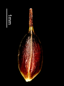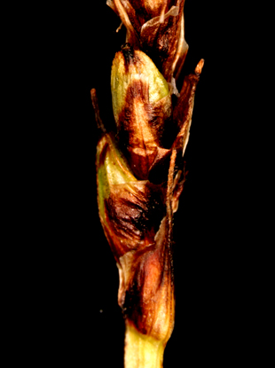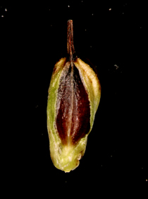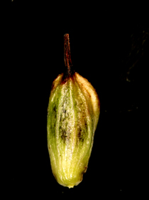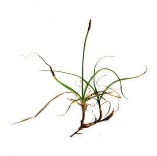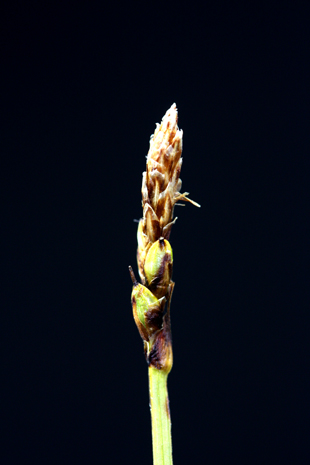 【同定のカギ】高山の岩礫地に生える多年草で横走する根茎があり、疎生する。花序は1個で雄雌性、頂部は雄花、基部は雌花となる。果胞は、雌鱗片とほぼ同長、長倒卵形、背面に5−7脈があり、無毛、嘴はほとんどなく、口部は全縁。痩果は、果胞にゆるく包まれ、花柱が残る。柱頭は3岐。Carex rupestris All. 【国内分布】北海道(夕張山地、日高幌尻岳)、本州(南アルプス仙丈岳、北アルプス雪倉岳)。【国外分布】朝鮮、サハリン、東シベリア。 【ノート】カラフトイワスゲは、日本では分布域が限られていて貴重な種である。花序は1個で、上部に雄花、下部に雌花をつける。