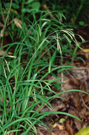 山道や路傍に普通に生える多年草で叢生する。植物体は全体が柔らかい。雌小穂は線柱形で長く、下垂する。果胞は、雌鱗片より長く、稜間に少数の脈があり、無毛、上部はしだいに狭まって長嘴となり、口部は切形。柱頭は2岐。
