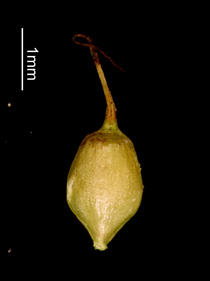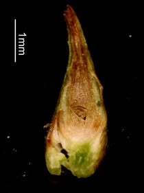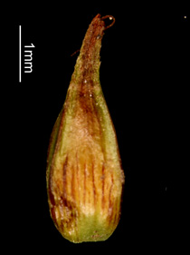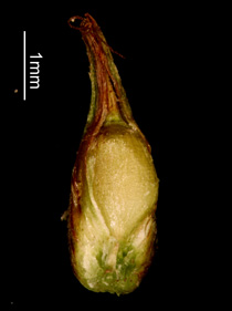 小穂、熟すると外曲 果胞、嘴は長く、縁に鋸歯、基部は海綿状に肥厚