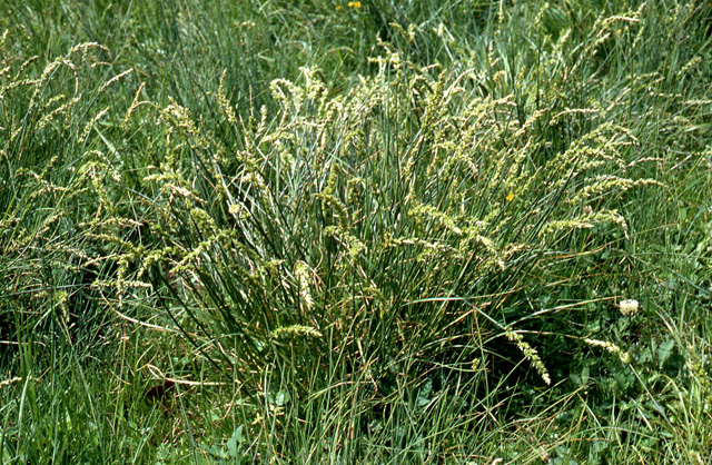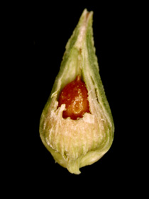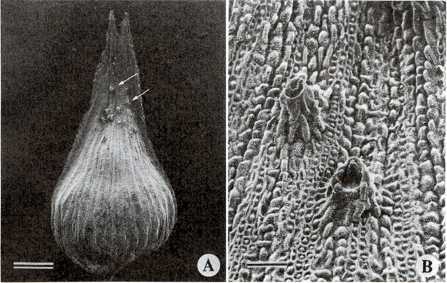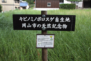 【同定のカギ】開けた草地に生える多年草で叢生し、大株となる。有花茎は平滑。果胞は、雌鱗片よりやや長く無毛、やや長嘴、口部は2小歯、赤い瘤状突起が上部にいくつか見られ、両側は狭い翼があり細鋸歯縁、基部は海綿状に肥厚。柱頭は2岐。Carex paxii Kuk. 【国内分布】岡山県岡山市吉備津彦神社。【国外分布】朝鮮、中国。 【ノート】キビノミノボロスゲは、果胞の上部に赤みがかった瘤状の突起物があることでミノボロスゲの仲間と区別できる。主に中国大陸や朝鮮に広く分布しており、日本では岡山県南部の神社の境内でのみ見られ、神社の禊用に持ち込まれたと考えられる。和名は、中国地方東部の古名である吉備にちなむ。