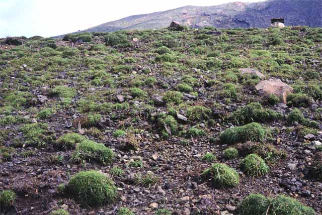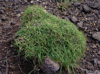 【同定のカギ】山地の草原や岩場、火山裸地に生える多年草で、叢生し匐枝がある。火山裸地ではマット状に分布し、岩場では、盛り上がった塊となる。果胞は、雌鱗片より超出し、微脈、疎らに短毛、基部に短柄、長嘴、口部は浅い2歯。柱頭は3岐。【国内分布】四国、九州。日本固有。 【ノート】九州地方の火山裸地、四国地方では石鎚山や立石山標高1,000 m前後の山地岩場に点在。ミヤマイワスゲに似るが、果胞の長さが4.3−4.5 mmと短く(ミヤマイワスゲは5.6−5.8 mm)、嘴が長く口部が浅い2歯となる。