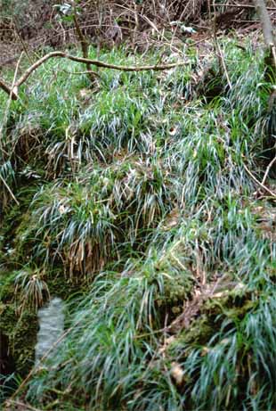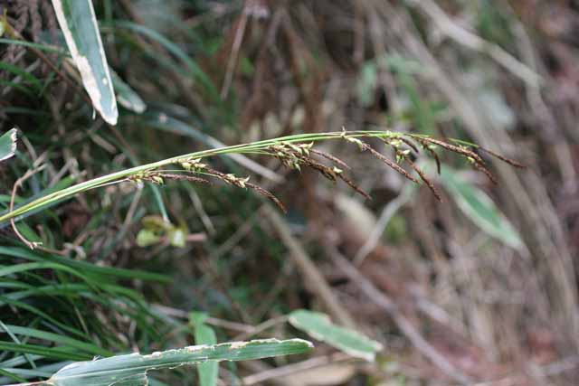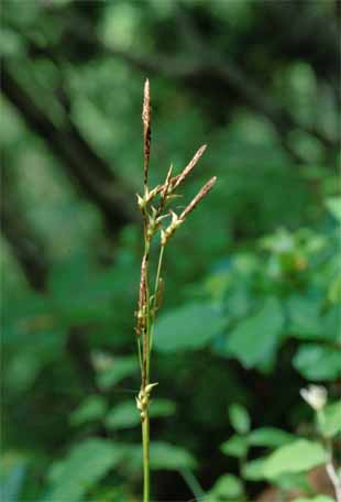 【同定のカギ】山地の林床や林縁に生える多年草で、匐枝を横走しやや硬い。葉は硬く、縁は著しくざらつく。小穂は、雄雌性で上部の半分以上は雄花、雌花は離れて付く。果胞は、雌鱗片より長く、外曲し稜間に8−10脈があり、疎に短毛があり、上部はしだいに狭まり長嘴となり、開出する。痩果の基部には柄があり、頂部に小型の盤状付属体がある。柱頭は3岐。【国内分布】:本州、四国、九州。日本固有。 【ノート】コカンスゲは側小穂が雄雌性であり、常に横走する匐枝を持つことで、林床に生育するヒメカンスゲや近縁種と容易に区別できる。また、葉縁が手を切るぐらい著しくざらつくことでも区別される。匐枝で栄養繁殖することから林床一面に生育するのがよく見られる。また、日の余り当たらない林床では花茎が大変少ないが、林縁の日向では花茎が多く立ち上がる。