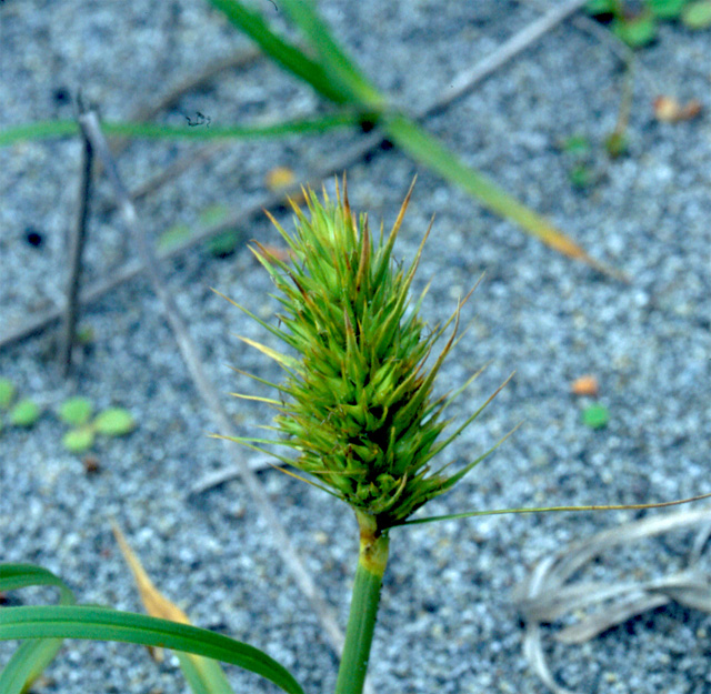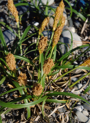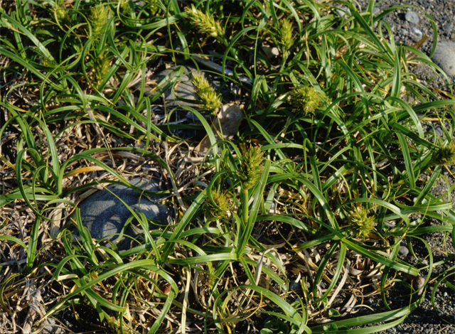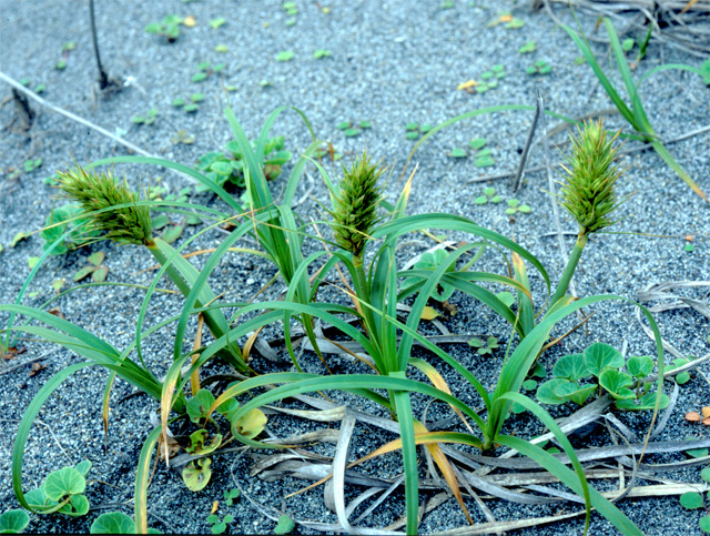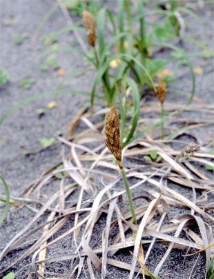 【同定のカギ】雌雄異株、まれに同株。海岸や砂浜に普通に見られる多年草。太く長い根茎がある。果胞は、雌鱗片と同長かやや長い、稜間に多数脈、無毛、縁辺に不整細鋸歯を持った狭翼があり、上部は狭くなって長嘴となり、口部は2歯、基部は海綿状に肥厚。柱頭は3岐。【国内分布】:北海道、本州、四国、九州。【国外分布】朝鮮、台湾、中国。 【ノート】海岸に普通に見られ、雌雄異株で長い根茎を持つ。近縁種のエゾノコウボウムギとは雌鱗片の芒が著しくざらつき、果胞が背曲しないことで区別される。