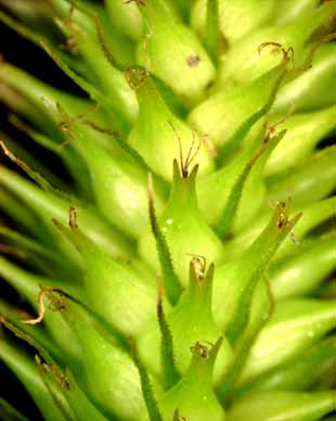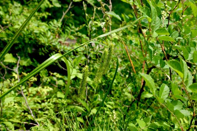 【同定のカギ】川岸や池畔で見られる多年草で密に叢生する。雄小穂は長い柄があり下垂する。鱗片は蒼白色〜淡褐色で長い芒がある。果胞は、雌鱗片より長く稜間に多数の脈があり、平滑、長嘴、完熟すると開出してつき黄色に変色、口部は深く2裂。柱頭は3岐。【国内分布】:北海道(道東)、本州(青森県、群馬県嬬恋村、長野県御代田)。【国外分布】シベリア−ヨーロッパ、北アメリカ。 【ノート】クグスゲの日本での生育地は限られていて、絶滅危惧1B類に指定されている。雄小穂は下垂し、鱗片の芒が特に長く、果胞の嘴は長く、口部は2深裂する。