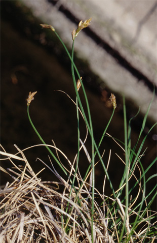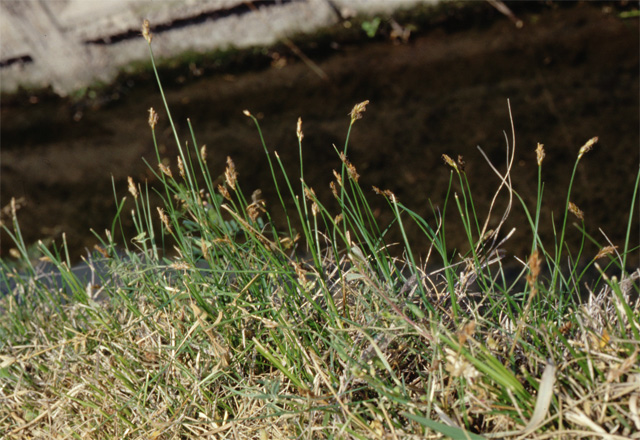 【同定のカギ】砂質の草地、湿地の周辺および海岸の砂地に生える多年草で、横走する長い根茎がある。小穂は頂部に集まり、雄雌性。果胞は、背面に多数脈、無毛、両側の縁は細鋸歯状、上部はしだいに狭くなり長嘴、口部は斜切形、基部は海面状に肥厚。柱頭は2岐。【国内分布】【国内分布】北海道、本州、四国、九州。【国外分布】朝鮮、中国北部、南千島、サハリン、東ロシア。 【ノート】砂地では根茎が一方向に長く伸び、節から一個ずつシュートが出る。平地では田の畦でも見られる。アサマスゲやウスイロスゲに似るが、果胞の両側の縁が翼状とならない。カワズスゲとは小穂の付き方や果胞の形態が異なる。