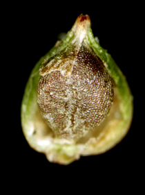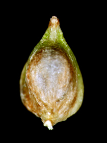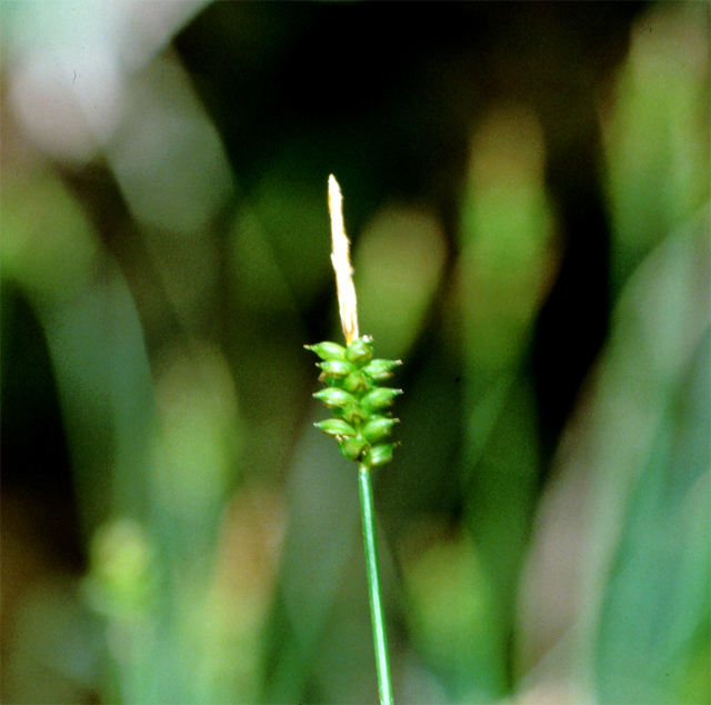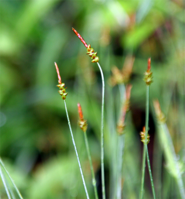 【同定のカギ】平地の湿地に生える多年草。有花茎は平滑。花序は頂生し、雄性部は長さ0.3−1 cm。雌性部は短柱形で長さ0.3〜1cm。果胞は、雌鱗片とほぼ同長、楕円形−卵形、長さ1.5〜2 mm、稜間に5−9脈あり、平滑、嘴は短く、開出、口部は凹形。痩果は、緩く果胞に包まれる。柱頭は3岐。Carex biwensis Franch. 【国内分布】北海道、本州、四国、九州。【国外分布】朝鮮、中国、ウスリー。 【ノート】マツバスゲは、ハリガネスゲとよく似るが、小穂が長く果胞が小さい(マツバスゲ:小穂1〜2cm、果胞1.5〜2 mm ハリガネスゲ小穂0.5〜1cm、果胞2〜3mm)。
