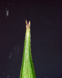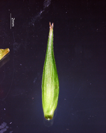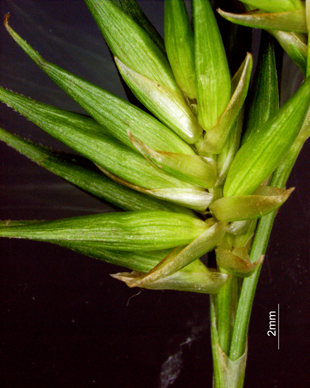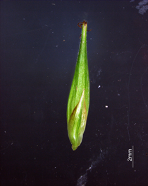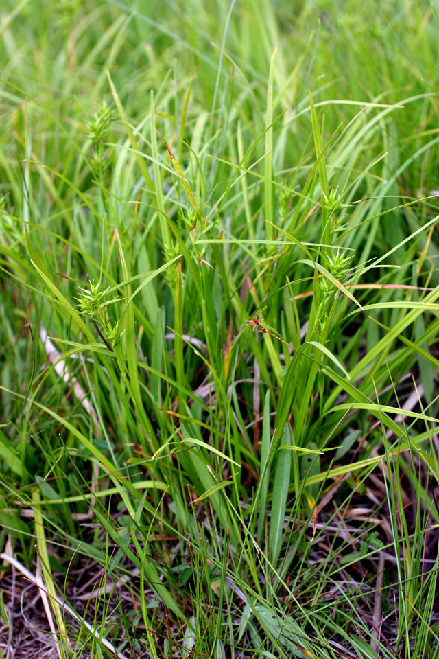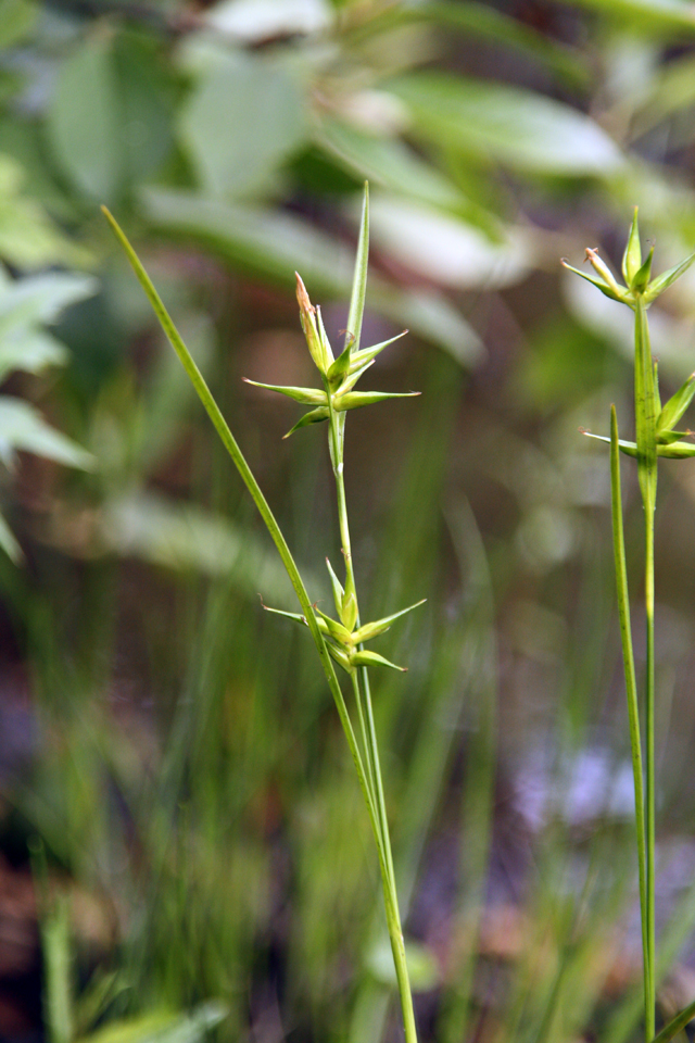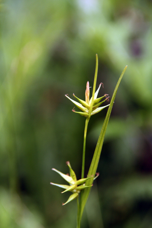 【同定のカギ】湿原の周辺に生える多年草。小穂は、花茎の上部に集まる。頂小穂は雄性で直下の雌小穂に続く。鱗片は淡褐色で中肋部分は緑色。果胞は、熟すと開出し、雌鱗片より長く、稜間に多数脈があり、無毛、長嘴で縁に細鋸歯があり、黄緑色、口部は2歯、基部は肥厚する。柱頭は3岐。Carex dolichocarpa C.A.Mey. ex V.I.Krecz. 【国内分布】北海道、本州(中部地方以北、岡山県)、九州(大分県)。【国外分布】千島、カムチャツカ。 【ノート】ミタケスゲは、北海道や中部地方以北に多く見られるが、中国地方や九州にも隔離分布する。