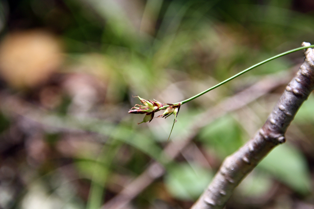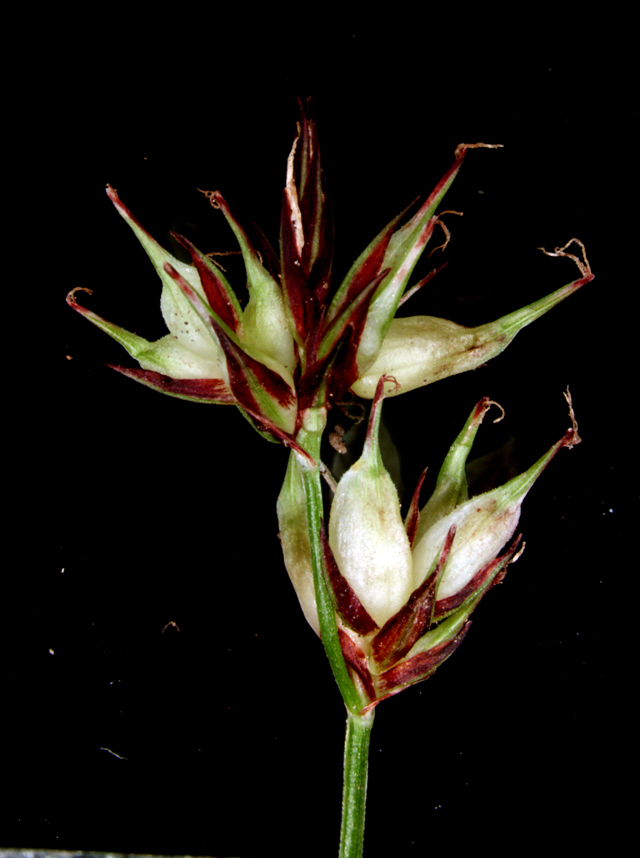 林縁や山頂の草地に生える多年草で、匐枝がある。鱗片は濃赤色。果胞は、無脈、疎に短毛、嘴は大変長く2−2.5 mm、口部は2歯。柱頭は3岐。