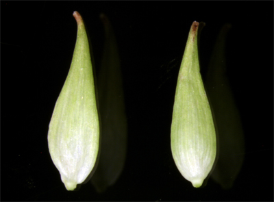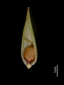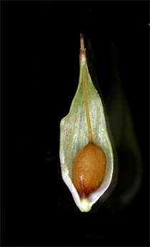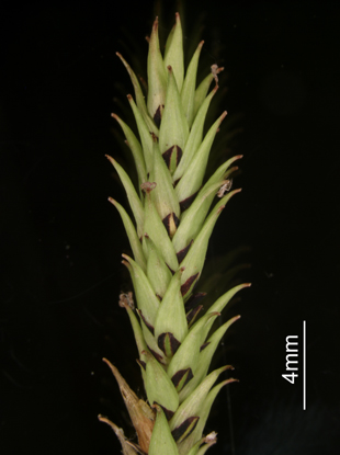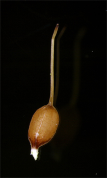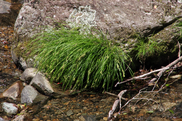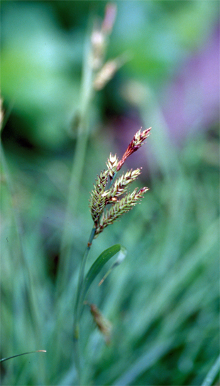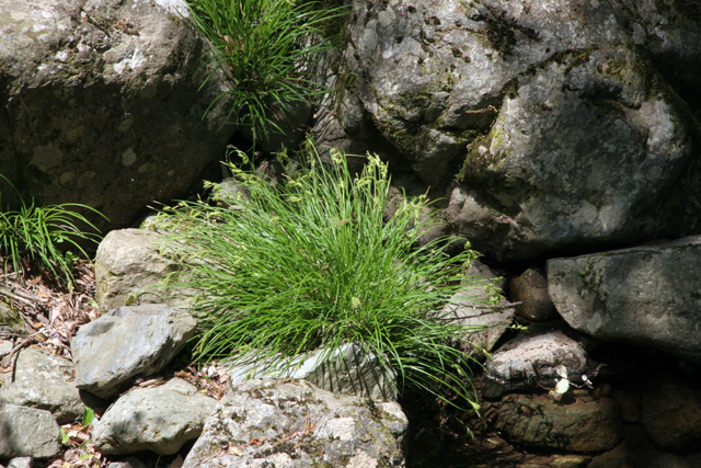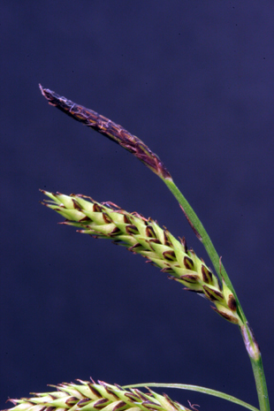 【同定のカギ】渓流沿いの岩場に普通に生える小型の多年草で密に叢生し大株となり、細く短い匐枝がある。全体が柔らかい。雄小穂を頂生し、雌小穂は柄があり下垂する。果胞は、雌鱗片より超出し、稜間に10−12脈があり、無毛、上部はしだいに狭まり長い嘴となり、口部は切形。柱頭は3岐。Carex curvicollis Franch. et Sav. 【国内分布】北海道、本州、四国、九州。日本固有。 【ノート】全国の渓流の岩場に普通に見られ大株となる。水際の岩を覆うように群生している。小穂は下垂し、植物体は小型で全体が柔らかく、雄鱗片は紫紅色。