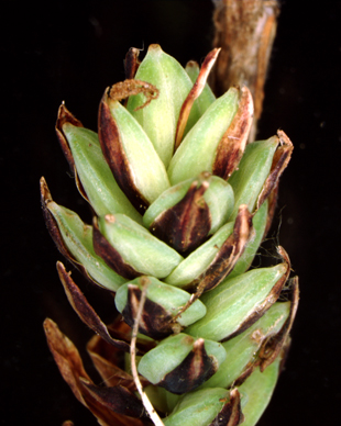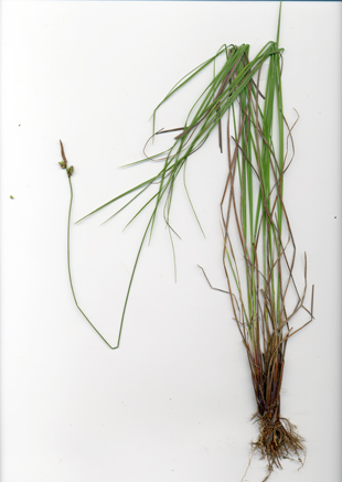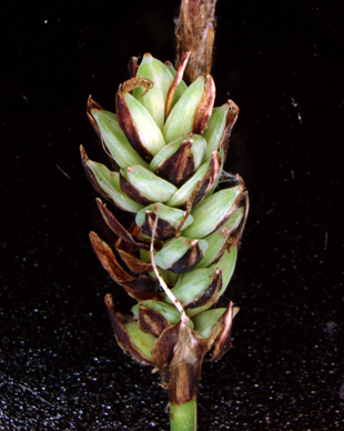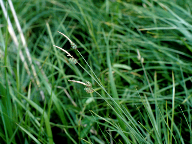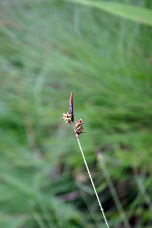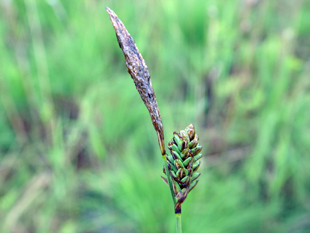 【同定のカギ】泥炭湿地に生える多年草で、大株となり、根茎は剛強で谷地坊主を作る。葉は、粉緑色でざらつく。小穂は、頂部に接近して付く。鱗片は、濃紫褐色。果胞は、雌鱗片と同長またはやや長く、4−5細脈、無毛、上部は急に狭まり短嘴となり、乳頭状突起を密布し、口部は切形。柱頭は3岐。Carex meyeriana Kunth 【国内分布】本州、九州。【国外分布】朝鮮、中国北東部、東シベリア。 【ノート】ヌマクロボスゲは、カブスゲに似て大株となり谷地坊主をつくるが、葉が粉緑色となり果胞が大きく柱頭が3(カブスゲは2)であることで区別できる。タルマイスゲとは根茎がないこと、頂小穂は雄性(タルマイスゲは雌雄性)であることで区別する。