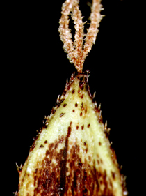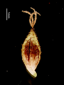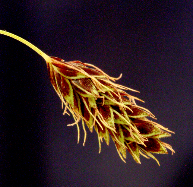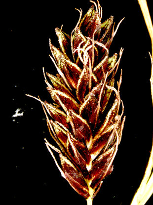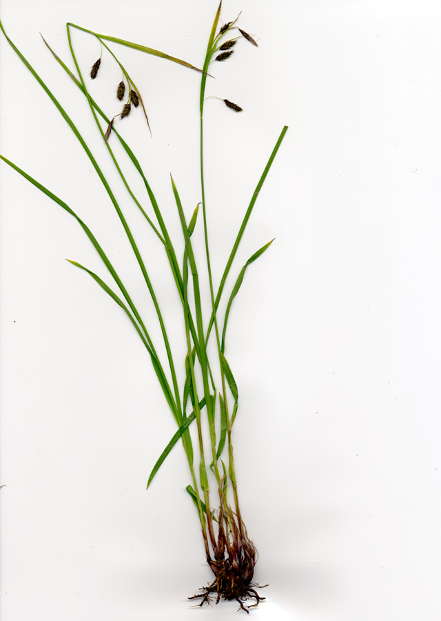 Carex scita Maxim. var. riishirensis Kukenth. 【国内分布】北海道の高山草地。【国外分布】サハリン。 【同定のカギ】北海道の高山の湿った草地に生える。有花茎の上部がざらつく。雌小穂は、柄が長く下垂する。鱗片は濃赤紫色〜濃赤褐色。果胞は、雌鱗片よりやや長く、長さ4.5−5 mm、幅1.5−2 mm、稜間に3−4の細脈があり、濃赤紫色の斑点があり、両側に刺毛がある、上部は次第に狭まり短い嘴となり、口部は凹形。柱頭は3岐。 【ノート】リシリスゲは、シコタンスゲに似るが、果胞の長さが短い。また、ミヤマアシボソスゲとは有花茎の上部がざらつくことで区別できる。