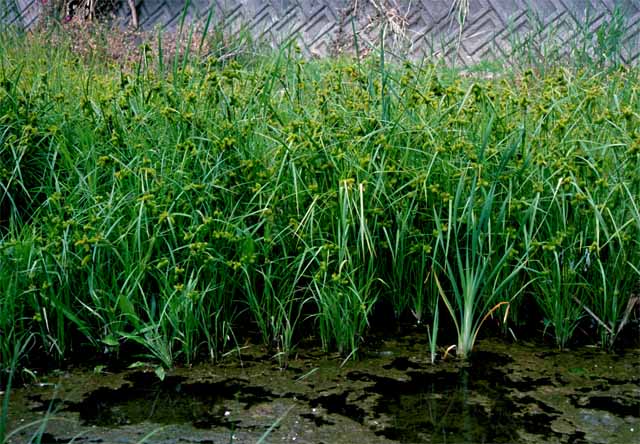 ジョウロウスゲ Carex capricornis Meinsh. ex Maxim. 【国内分布】北海道、本州(関東地方以北)。【国外分布】朝鮮、中国東北、ウスリー。 【同定のカギ】川岸や池畔に生える多年草で、密に叢生する。小穂は有花茎の上部に集まる。頂小穂は雄性、雌小穂は密に果胞を付け,円柱形。果胞は、雌鱗片より長く、披針形、基部に短柄、稜間に多数の脈があり、平滑、長嘴、完熟すると黄色に変色し、口部は深く2裂し裂片が外曲する。柱頭は3岐。 【ノート】ジョウロウスゲの雌小穂は円柱形で大きく、大変目立つ。果胞は細長く、口部は深く2裂していて裂片が外曲する。