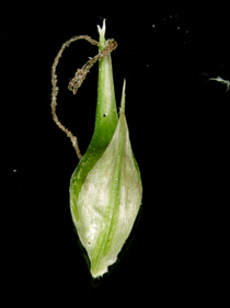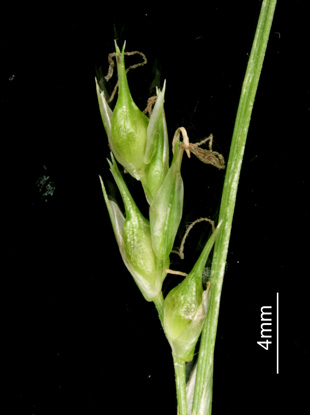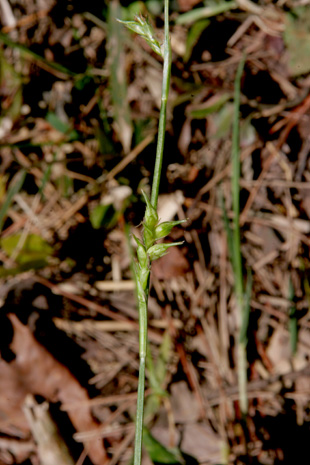 【同定のカギ】アカマツ林の林床や乾燥した樹林内に生える多年草で、疎らに生え、長い匐枝がある。果胞は、雌鱗片より長く、熟すとやや開出し、無毛、上部はしだいに狭まり長い嘴となり、口部は2歯。花柱の基部は湾曲する。柱頭は3岐。【国内分布】本州(福井県−鳥取県、広島県の日本海側)。日本固有。 【ノート】2004年に鳥取県をタイプロカリティとして新種発表された。長い匐枝、長嘴の口部が2歯となることが特徴的である。