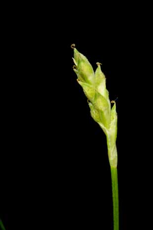 林縁の斜面に生える。やや叢生、稀に短い匐枝。苞葉は短く刺状。小穂は長い柄を持ち、鱗片は緑白色。果胞は、雌鱗片より長く、明瞭な脈、短毛を密布、短嘴、口部は凹形、基部は長柄。柱頭は3岐。