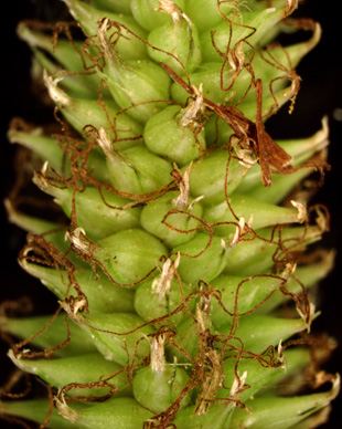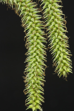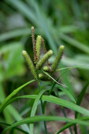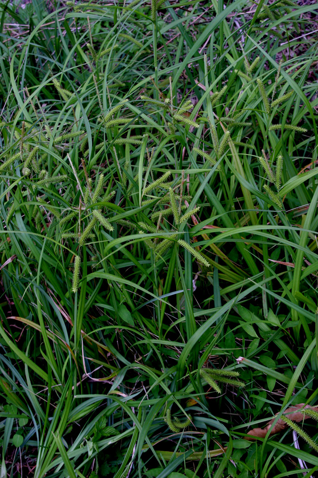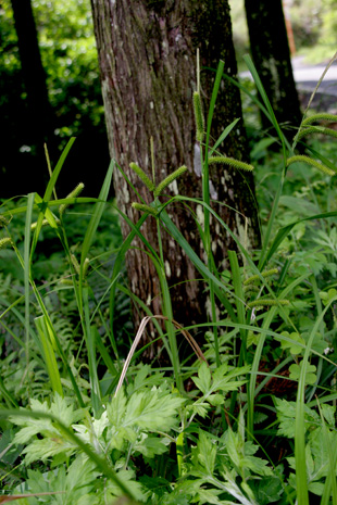 【同定のカギ】山地の林床や林縁に普通に生える多年草で、オオカブトなり匐枝を持つ。葉裏に乳頭状突起を密布。雄小穂を頂生し、雌小穂は線柱形で下垂する。鱗片は蒼白色で果胞より短い。果胞は、陵間に3−5脈あり、平滑、嘴は長く、口部は2歯。柱頭は宿存することが多い。柱頭は3岐。Carex doniana Spreng. 【国内分布】】北海道、本州、四国、九州、対馬、南西諸島、伊豆諸島。【国外分布】東アジア、マレーシア、ヒマラヤ。 【ノート】日当たりの良いやや乾いた場所にも生育しており、雄小穂が短く斜上して垂れ下がらない個体もある。