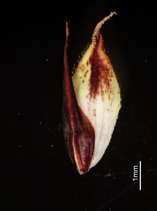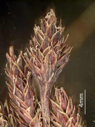 【同定のカギ】2000〜3200mの高山の岩場や草原に見られ、花茎は高さ40〜70cm。頂生する小穂は上部が雌花で、基部に雄花がある。側生する雄小穂は下垂する。鱗片は濃赤紫色で芒がある。果胞は、扁平で縁に剛毛があり、上部は次第に狭まり口部はわずかに2嘴となる。痩果の基部には柄がある。柱頭は3岐。Carex scita Maxim. var. brevisquama (Koidz.) Ohwi 【国内分布】日本海側の高山、月山、燧岳、白山など。日本固有。 【ノート】シロウマスゲは、アシボソスゲほど口部は長くなく芒も短い(3mm以下)。また、ミヤマアシボソスゲは果胞の口部が凹型で嘴がなく、シロウマスゲとは区別される。ダイセンアシボソスゲは果胞が5mm以下で、シロウマスゲの方が長い。