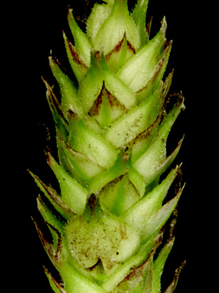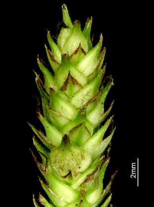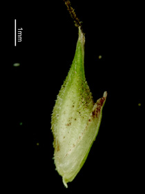 【同定のカギ】河川高水敷に生える多年草。疎に生え、横走する長い根茎がある。雄小穂は2〜5個で頂生し、雌小穂は密着して付く。果胞は、雌鱗片よりやや長く、脈があり、有毛、先端はしだいに狭まり長嘴、緑色、口部は深く2歯となる。柱頭は宿存する傾向がある。柱頭は3岐。Carex glabrescens (Kuk.) Ohwi 【国内分布】本州(岩手県、宮城県、山形県、栃木県、群馬県、茨城県、長野県)。【国外分布】朝鮮、中国東北部。 【ノート】スナジスゲは、ビロードスゲに似るが雌小穂が密着する、果苞の嘴が急に細くならずゆるやかに狭くなる点が異なる。