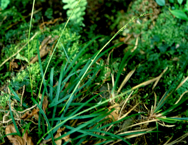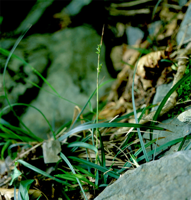 ヒメカンスゲに似るが、葉の先端が急に狭まり、鱗片の先端は鋭頭で無芒、疎花であることで区別される。渓谷の薄暗い岩場に点在し、個体数は少ない。