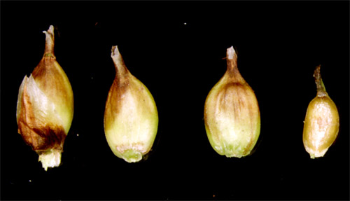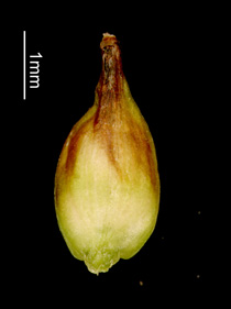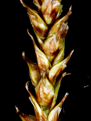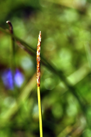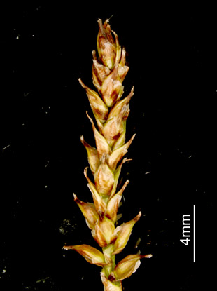 Carex kabanovii V. Krecz. 【国内分布】北海道(大雪山の高層湿原に稀産する)。【国外分布】サハリン。 【同定のカギ】雌雄異株(まれに同株)で、高山の湿地に生える。葉は硬質。花序は、単性だがまれに雄雌性。果胞は、雌鱗片より長く、背面に少数脈あり、無毛、後に斜めに開出、上部は狭まってやや長い嘴となり、口部はやや開出した2歯があり、基部は海綿状に肥厚する。柱頭は3岐。 【ノート】カンチスゲに似るが、葉の幅が広く、小穂が長い。また、果胞の嘴は長く、口部はやや深い2歯となり、果胞が雌鱗片より長い。