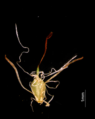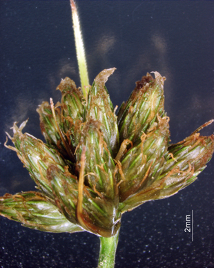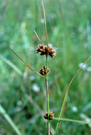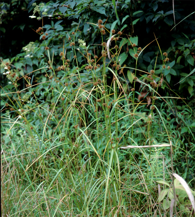 【同定のカギ】日当たりの良い湿地や池のまわりに生える多年草。有花茎は、硬く、高さ0.8−1.2 m、横断面は鈍3稜形、4−5節ある。葉は、硬く線形、幅3−4 mm。頂花序は、1回分枝、分花序は3−6個、側生分花序は1−2個、分花序は小穂が10−30個集まって球状となる。小穂は、楕円形、長さ5−7 mm、完熟すると褐色となる。鱗片は、長さ3−4 mm、幅1−1.3 mm、鋭頭。痩果は、長さ1.3−1.5 mm、淡褐色。刺針状花被片は、5−6本、糸状で屈曲し、痩果より極めて長く、上部は上向きにざらつく。柱頭は、3岐。Scirpus fuirenoides Maxim. 【国内分布】本州、四国、九州。日本固有。 【ノート】コマツカサススキはマツカサススキとよく似ているが、花序は球状となり、小穂の鱗片の幅が1 mm以上と広く、葉の幅は逆に3−4 mmで狭い。