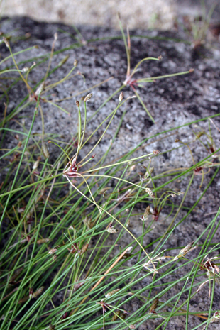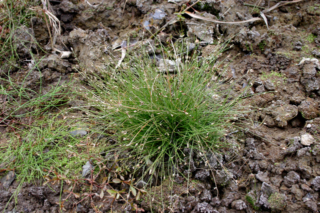 【同定のカギ】湿地や池の周辺、水田跡地に生える1年草または多年草で、匐枝はない。有花茎は、細く、直立または斜上し、高さ10−20 cm、鮮緑色。小穂は、頂生し、卵形、密に花をつけ、長さ4−6 mm、時に基部に腋芽ができる。鱗片は、長さ1−1.5 mm、やや鈍頭、一部に錆色の部分がある。痩果は、長さ0.7−0.8 mm、黄緑色、横断面は鈍3稜形。柱基は、3角錐状、幅は痩果の1/3、長さは幅の1.5倍。刺針状花被片は、6本、痩果の1.2−1.5倍の長さで下向きにざらつく。柱頭は、3岐。Eleocharis congesta D.Don var. japonica (Miq.) T.Koyama 【国内分布】北海道、本州、四国、九州。 【ノート】オオハリイやエゾハリイによく似るが、オオハリイとは痩果の長さが0.7−0.8 mmと短い (オオハリイは1 mm) 。有花茎が倒れて小穂から腋芽を出すことが多い。