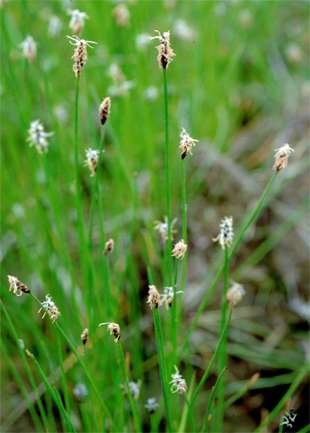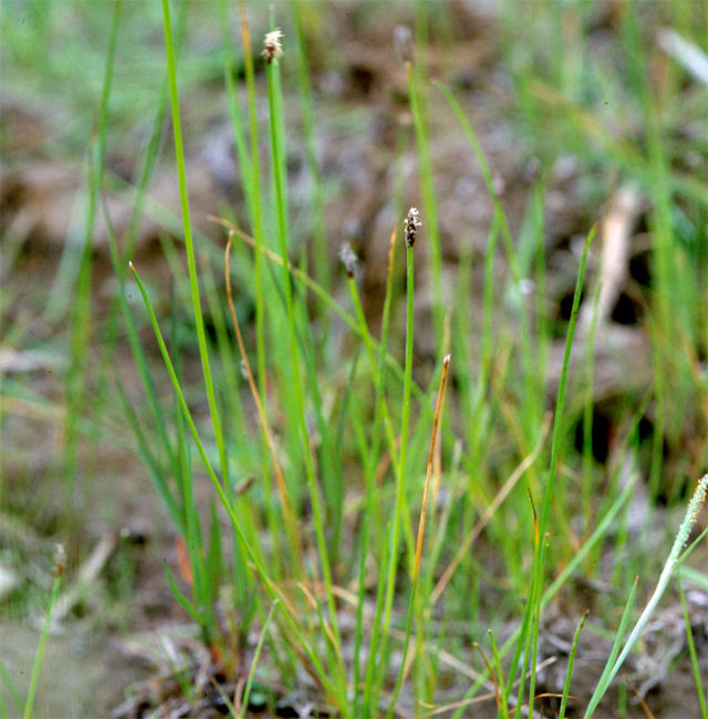 【同定のカギ】河川の平坦地や湖畔に生育する多年草で、長い匍匐根茎がある。有花茎は、高さ30−60 cm、幅1−2 mm、円くて平滑、柔らかく、有花茎の内部は綿状。小穂は、披針形、長さ1−1.5 cm、先はやや尖る、濃褐色。鱗片は、長さ約5 mm、鈍頭、薄膜質、濃褐色。痩果は、長さ1−1.2 mm、横断面はレンズ状、熟すと淡褐色となる。柱基は、小さく、3角錐状。刺針状花被片は、4本あって、痩果の約1.5倍の長さがあり、下向きにざらつく。柱頭は、2岐。Eleocharis parvinux Ohwi 【国内分布】本州 (宮城県、栃木県、茨城県、千葉県、神奈川県)。日本固有。 【ノート】コツブヌマハリイは、刺針状花被片は4本で、直立し、下向きにざらつく。
