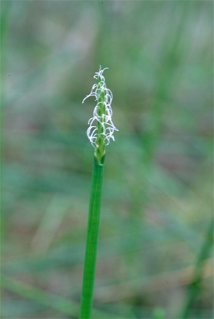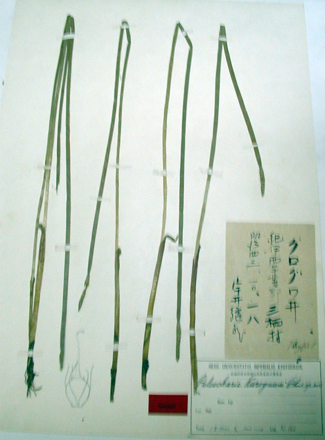 【同定のカギ】ため池や水田の湿地に群生する多年草で、やわらかく長い根茎がある。先端に、1 cmくらいの黒褐色の塊茎をつくる。有花茎は、円筒形、太く、高さ30−80 cm、幅3−4 mm、内部は多くの隔膜で仕切られ、乾くと外からは節があるように見える。小穂は、円柱形、長さ2−4 cm、鈍頭、淡緑色。鱗片は、狭卵形、長さ6−8 mm、鈍頭、薄膜質、淡緑色。痩果は、長さ2 mm。柱基は、小さく、盤状の付属体がある。刺針状花被片は、5−6本、痩果より長く、疎らに下向きの剛毛をつける。柱頭は、2岐。Eleocharis kuroguwai Ohwi 【国内分布】本州 (関東地方から太平洋側西部、北陸地方から日本海側西部)、四国、九州、九州、琉球 (奄美大島)。 【国外分布】朝鮮南部。 【ノート】イヌクログワイ (シログワイ) とは鱗片が狭卵形であることが異なる。