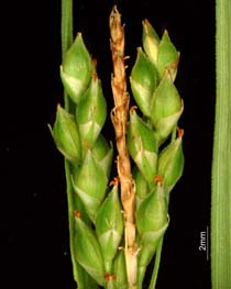 【同定のカギ】石灰岩地の草原に生える多年草。根茎は短く横走。有花茎:高さ30−70 cm。雄小穂を頂生するが細く、雌小穂に隠れる。果胞は、ややまばらに付き鱗片より長く、短毛を密生する。柱頭は3岐。【国内分布】本州(山口県秋吉台)、九州(福岡県平尾台)。 【国外分布】韓国、中国。 【ノート】平尾台と秋吉台で確認されていて日本における分布は限られている。生育地はいずれも石灰岩地域で、日当たりの良い場所に見られる。秋吉台では毎年野焼きが行われ、アカネスゲが生育できる環境が維持されているものと思われる。秋吉台管理事務所より調査許可証(第4号2005年5月)。